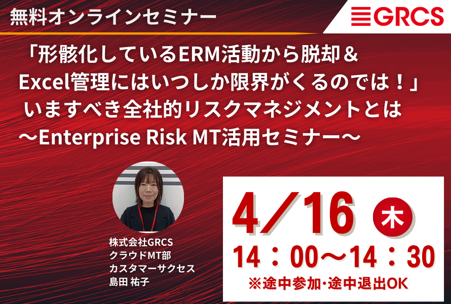 【4/16開催】「形骸化しているERM活動から脱却&Excel管理にはいつしか限界がくるのでは!」 いますべき全社的リスクマネジメントとは~Enterprise Risk MT活用セミナー~