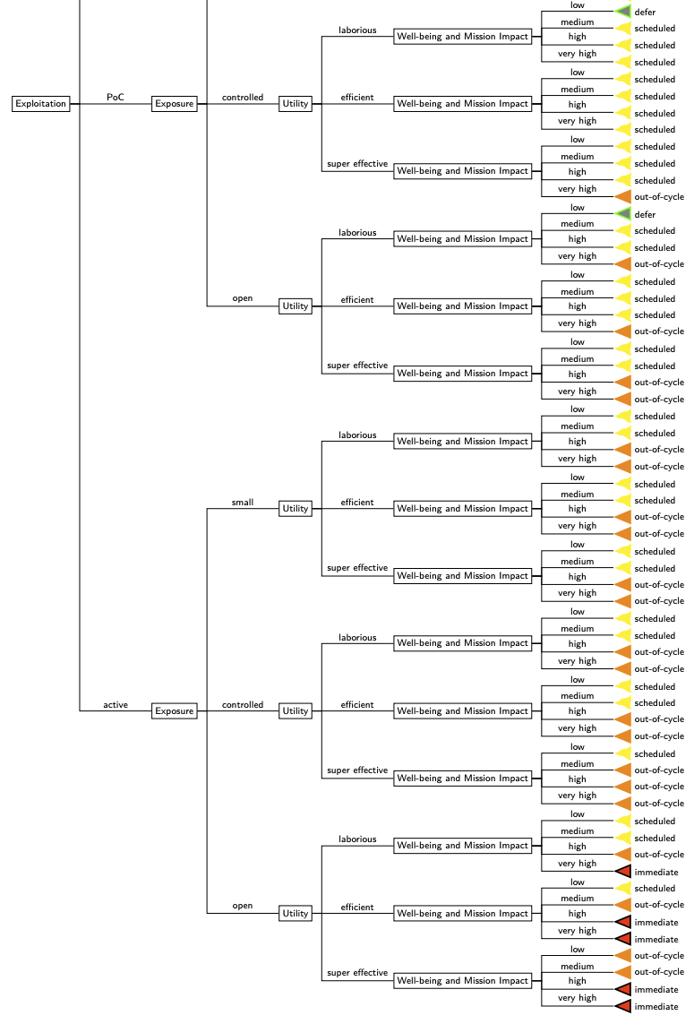SSVCは、米カーネギーメロン大学ソフトウェア工学研究所によって提案されたもので、CVSSが脆弱性の「技術的な深刻度」を評価しているに対し、SSVCでは脆弱性に対して「どのように行動すべきか」を決定します。ステークホルダーとしてサプライヤー、デプロイヤー、コーディネーターの3つが定義されており、それぞれのディシジョンツリー(決定木)が提案されています。具体的には、(決定木)によって、対応方針を決定するのですが、パッチを適用する側であるデプロイヤーの対応方針は以下の4つです。・out-of-cycle:通常よりも迅速に対応