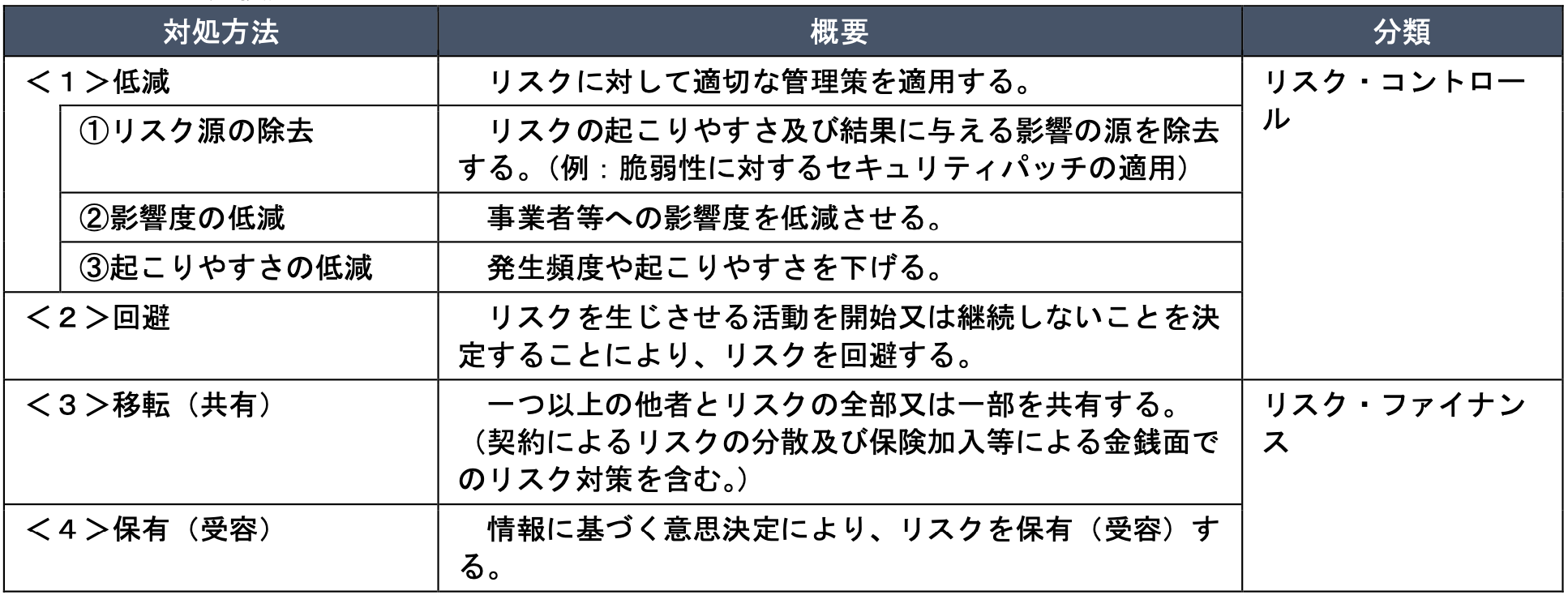 シナリオベースのリスク分析の手法でリスクの特定・評価を行ったら、次は、各シナリオ(=各リスク)について、リスク対応方針を決定します。具体的には、各シナリオ(=各リスク)に対して、どのような対処を、いつまでに行うかを決定することです。対処の方法には、「リスクの低減」「リスクの回避」「リスクの移転」「リスクの保有」の4つがあります。本手引書にはリスク対応の選択肢についても詳しい説明が載っています。